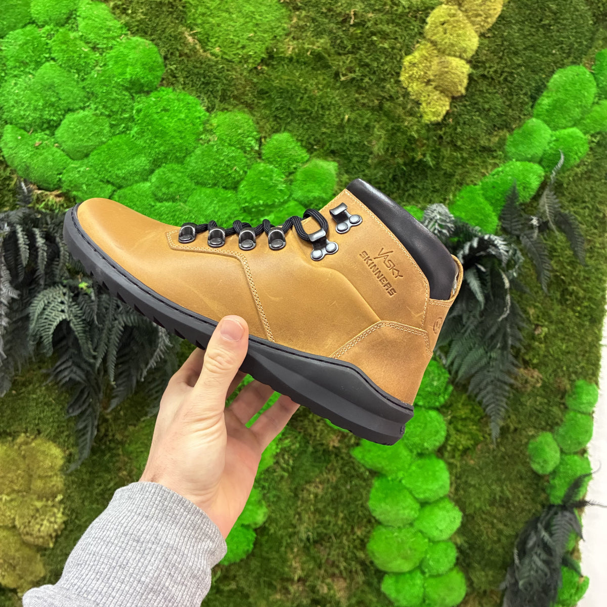 Vasky X Skinners shoes are made of premium smooth leather with a finely structured surface characterized by small pores and a natural pattern with small wrinkles. The properties of such a material give the shoes a unique character. Unlike smooth white and black leather, this brown leather "works" over time - its color and appearance change, which contributes to the authentic aging of the shoes. The tongue and ankle area of the shoe are complemented by pleasantly soft and durable goat leather. The lining is insulated with plush with a low pile.