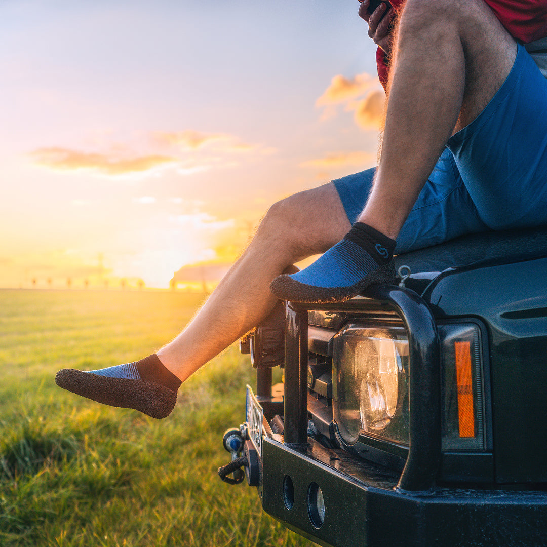 So I started researching and came across Skinners Footwear. What I like about them is their simplicity; they took socks and added a thin layer for grip. Making it very lightweight and even though you feel the ground and everything on it; it does not hurt.