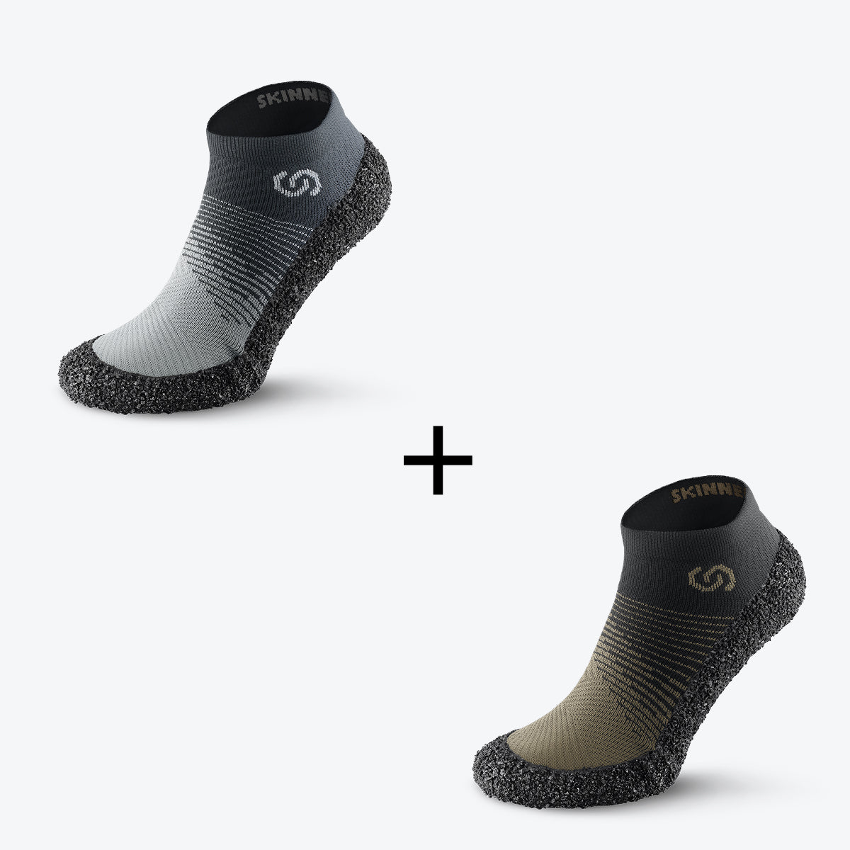Dva páry ponožkobot Skinners Comfort 2.0 pro dvojnásobné pohodlí a svobodu pohybu. Každý pár kombinuje odolnost, lehkost a kompaktní design, který se snadno sbalí do jakéhokoli batohu nebo kufru.